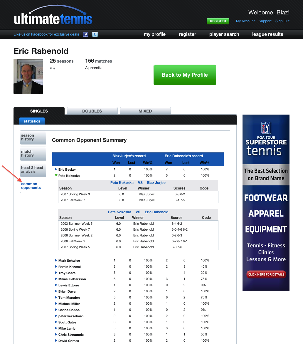 Review common opponent match results between you and another player by clicking a player's name and then the common opponents tab. This is a great way to determine the strength of opponents you have never played.