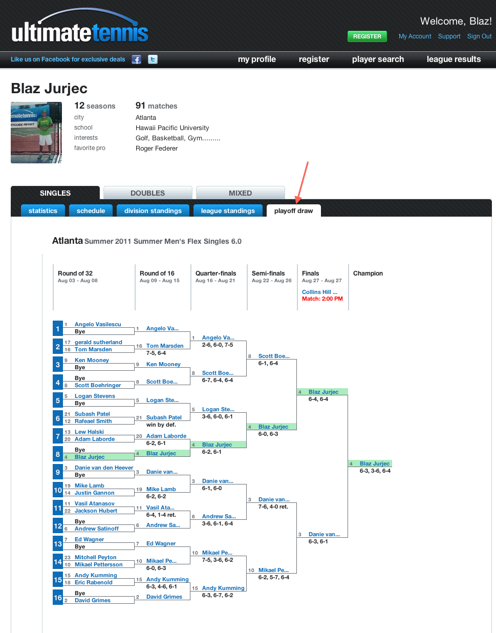 The league standings page shows the ranking order for all divisions at your skill level - in your city area. The final league standings at the end of the season will set the seeding order for the playoff tournament. Your name will be highlighted in green in the standings. Click another player's name to review their playing history.